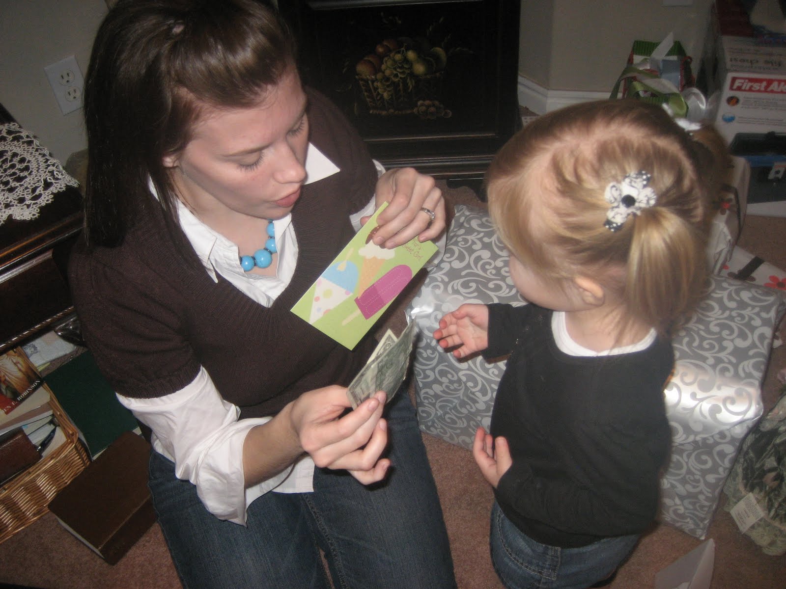Later that night everyone came over to do presents and cake with Kylee. Her first present was from Grandma and Grandpa Olson-$2 for turning 2!